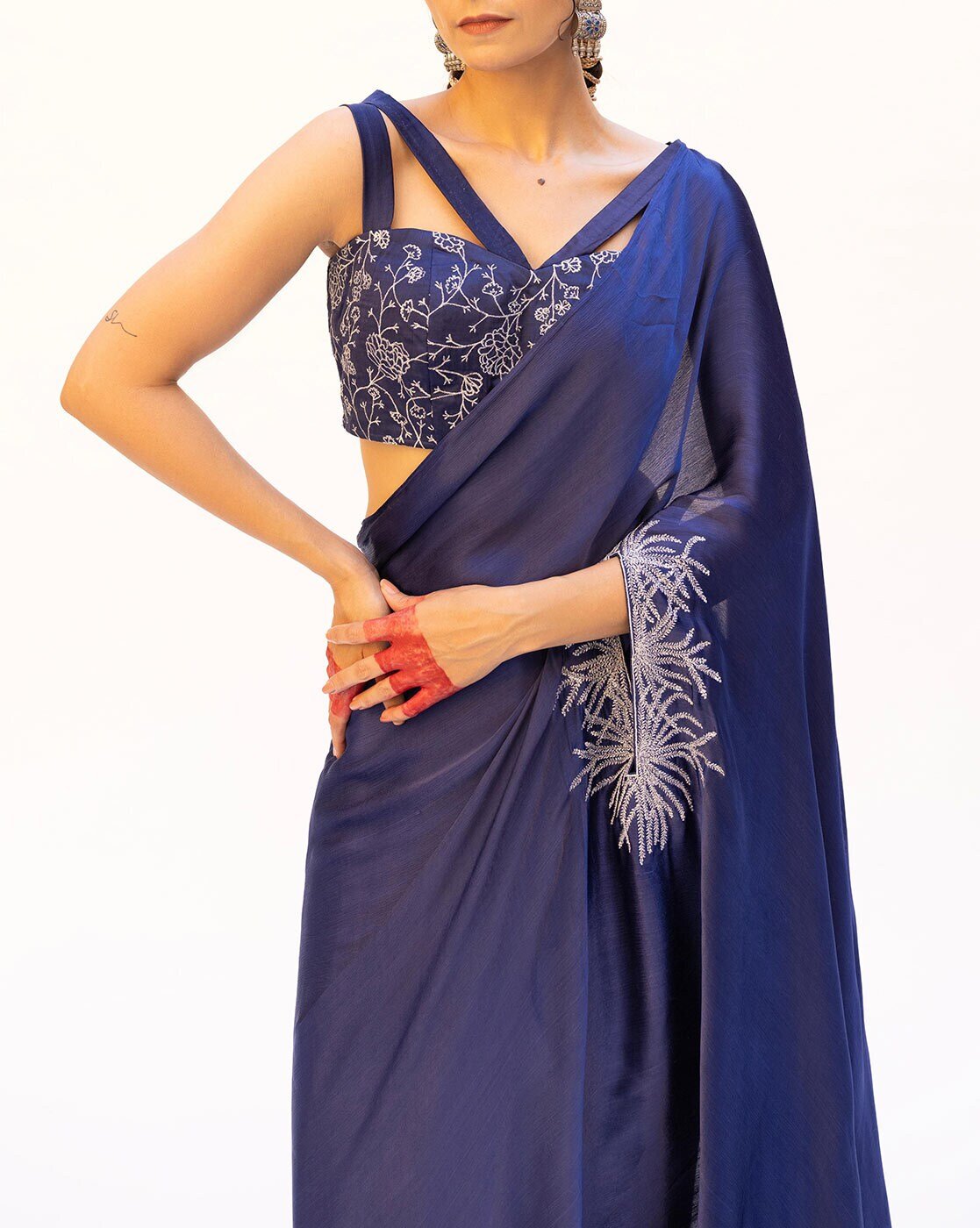• Classic Blue pre-draped saree, featuring an embroidered slit for a touch of allure. Paired with a silver embroidered blouse, adorned with elegant strap details and a center back zipper closure. This ensemble exudes modern sophistication with a hint of traditional charm.